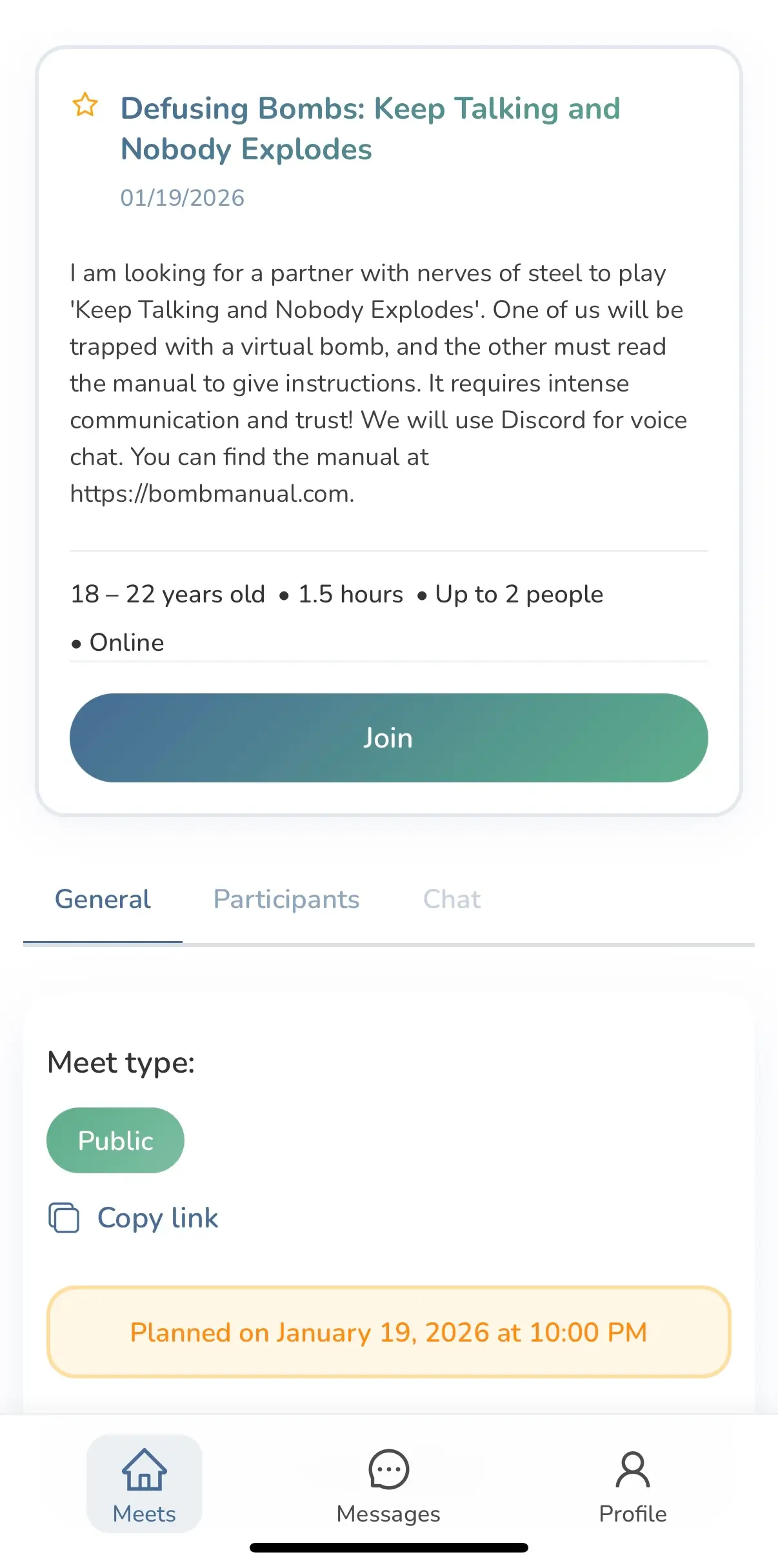 Not dating. Not a social network. Small groups for walks, cafes, board games and live communication.